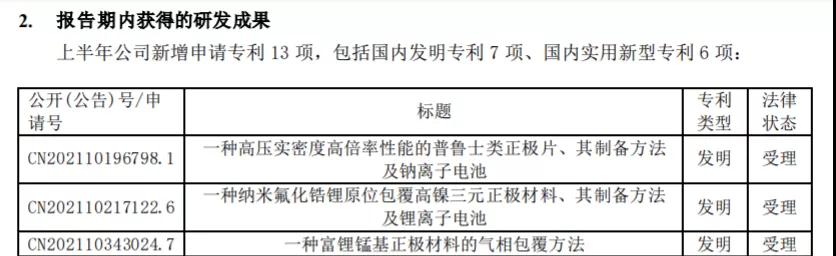 获得基础性专利许可的同时,在三元正极材料领域,容百科技同样也在加快产品研发和专利布局的脚步。半年报显示,截至2021年6月30日,容百科技在国内外拥有127项注册专利,主要涉及三元正极材料等。容百科技是国内最早开展811高镍正极材料研究、批量制造的企业之一,经过长期深耕积累了大量具有自主知识产权的技术,并对技术进行了全方位的知识产权布局。
