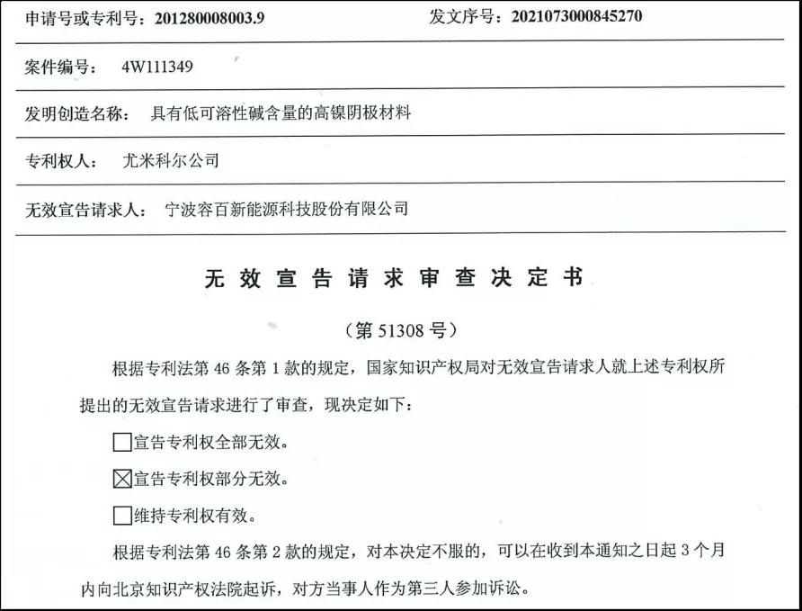 2021年8月,国家知识产权局发布的无效宣告请求审查决定书(第51308号)显示:2020年11月,容百科技对比利时优美科公司的专利号为ZL201280008003.9的专利提起了无效宣告请求;今年7月28日,国家知识产权局发布决定书“宣告专利权部分无效”,这是容百科技取得的关键阶段性成果。选择申请宣告对方专利无效这一做法无疑是坚决反击的举措之一,该案件仍在审理当中,容百科技有可能继续发起专利无效宣告请求甚至反诉。