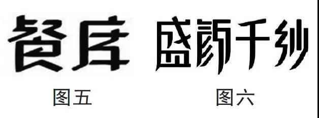 答:过于夸张的艺术设计汉字与轻度不规范艺术设计汉字相比,设计尺度更大,对汉字本身结构改变也更大,其汉字字形结构设计过于夸张。以图五、图六为例,其中“餐、库、颜”对汉字本身的结构进行了较大改变,视觉上文字显得较为别扭,缺失了汉字自身规则的约束,这种艺术设计汉字往往会被以汉字不规范使用为由驳回注册申请。