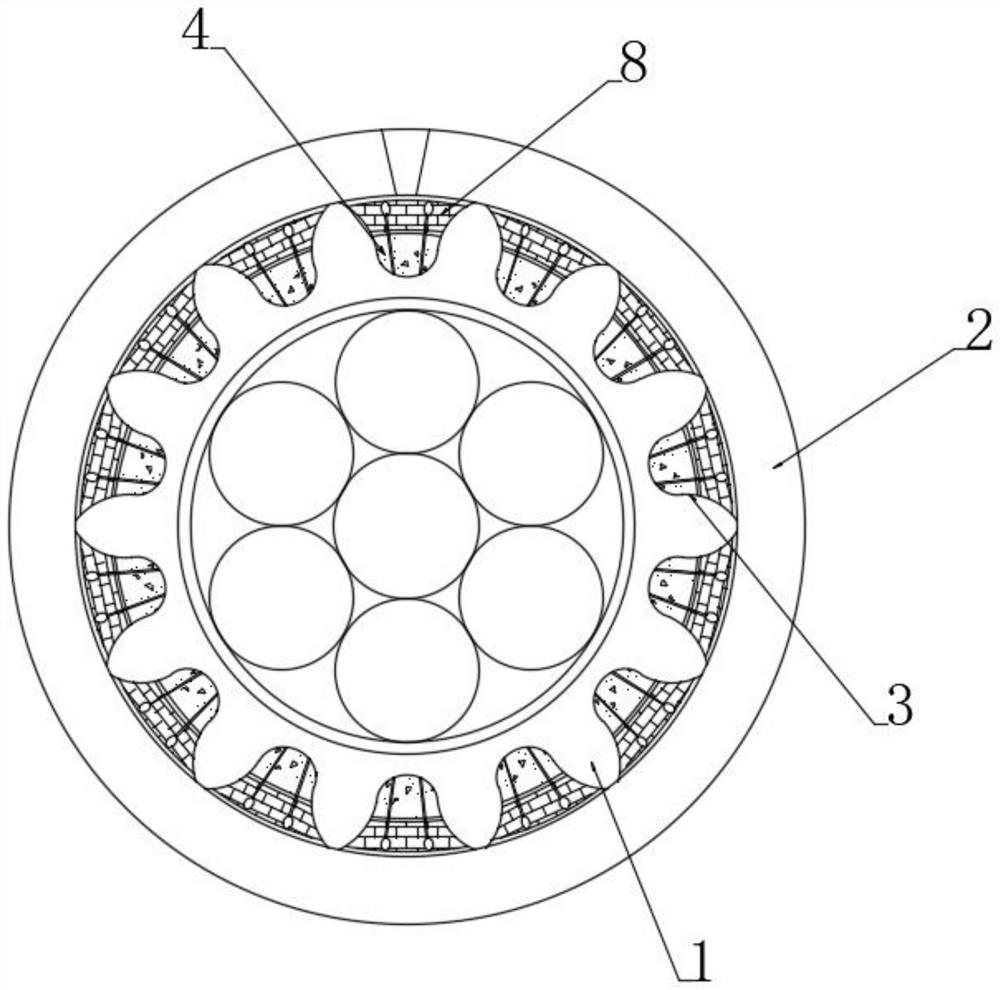 | 详情介绍: 本发明公开了一种防渗自愈型地下预埋电缆护套,属于电缆技术领域,通过设置内外套设的内护套和外护套,在内护套上嵌设安装上多个修补嵌设体,当外护套外端壁产生裂纹时,外界水汽渗入外护套内,修补嵌设体上的水溶释热囊遇水溶解裸露出其内部的还原性铁粉,还原性铁粉遇空气反应产生热量,并将热量传导至热胀填充层处,热胀填充层受热膨胀对嵌设于其内部的弹性出料囊进行挤压,以此实现将弹性出料囊内部的修补料向外导出,导出的修补料透过水解蓄热层对外护套处的裂纹处进行填充修补,完成对受损部位的自修补,实现外护套的自愈能力,有效避免电缆护套出现上时间的渗漏问题,有利于电缆的长效安全使用。 |