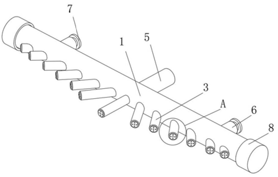 | 详情介绍: 本实用新型公开了一种新型五机架连轧机出口乳化液吹扫装置,包括主管,所述主管的侧面开设有安装孔,所述安装孔的外端固定连通有喷嘴引管,所述喷嘴引管内表面的外端固定套接有喷头,所述主管的背面固定连通有进气管,所述喷嘴引管的长度向两侧依次递减。该新型五机架连轧机出口乳化液吹扫装置,通过根据距离带钢中心的位置调整吹扫喷嘴引管,额喷嘴引管向两侧倾斜布置,使带钢表面吹扫面形成一条弧线,便于带钢中部残留水分吹向两侧,且引管长度依次缩短,使带钢表面的残留乳化液增加向两侧的流向,提升吹扫效果,并使得吹扫气源为中间进气,提升压空管道内气流均匀性,进而实现对钢带表面乳化液的有效吹扫。 |